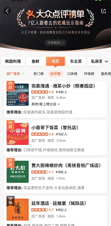 湖南完美湘遇湘菜馆每一家门店开业,都会迅速成为该区域内消费者打卡的热门地标,迅速霸榜大众点评区域排行榜榜首。在无推广、无引导情况下,充分证明了完美湘遇强大的 品牌实力与坚实的消费者口碑。